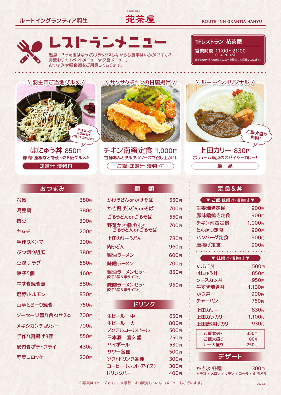 | ランチ・夕食 | 11:00~21:00 (ラストオーダー20:45) |